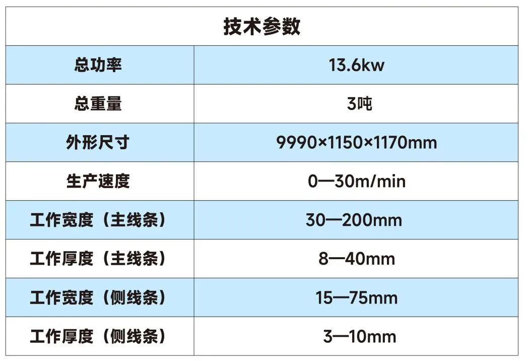 本机器由两部分组成:拼条主机和自动上料机,且此机将两条木线或类似材料涂上热熔胶 EVA 或 PUR 并压合成L型;此进料机可以一个压一个地叠放300 mm高的工件,所放线形工件必须是可叠压的;在进料台出口处有个高度调节控制闸门只允许一个工件通过送进系统是 600mm长的柱形气动装置将工件前端推进下道设备,使下道设备能传送工件。