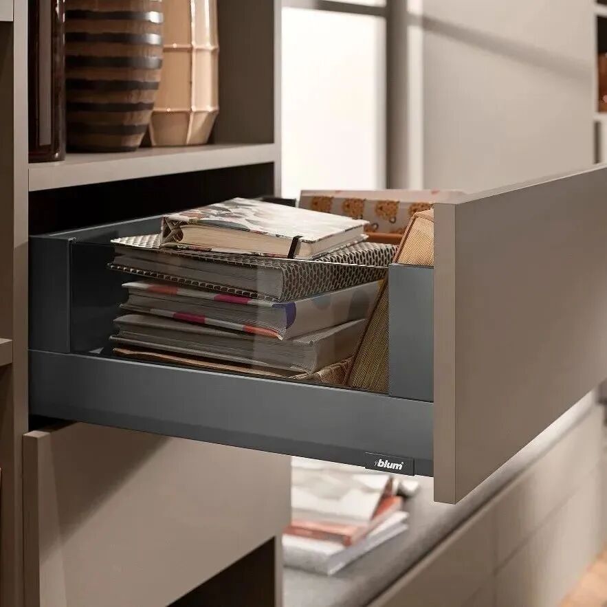 即便负有重物,MERIVOBOX 魅宝®金属抽屉系列依然顺滑又稳定。除了同步滑动性能之外,面板的出众稳定性也为全屋设计提供了新的可能 —— 高面板和低抽帮可以轻松组合在一起。