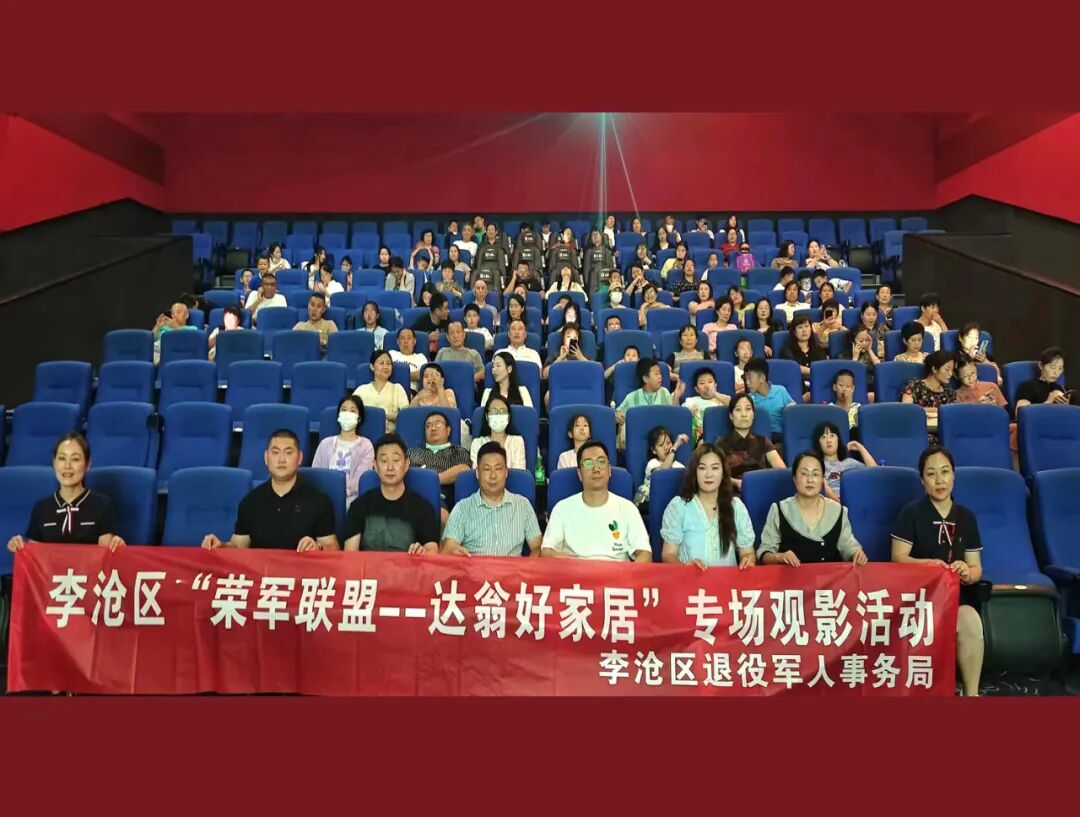 为深入学习贯彻党的二十大精神,纪念延安双拥运动80周年,增强广大军人军属、退役军人和优抚对象的荣誉感、自豪感,丰富他们的文化生活,以实际行动营造全社会爱国拥军、关爱退役军人及其他优抚对象的浓厚氛围,8月17日,李沧区退役军人事务局联合协会会长单位——达翁建材家居广场——好家居联盟,组织开展退役军人及其他优抚对象代表“清凉一夏”专场观影活动。