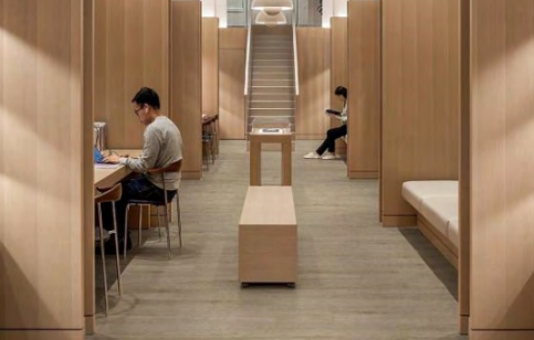 石木高分子复合地板底层的垫层可选择带有发泡垫层或者软木垫层,起到吸音、隔音的作用,适合用在影院、图书馆、阅览室等需要长时间保持安静的地方,其在阅读场所的铺装效果如下图所示。