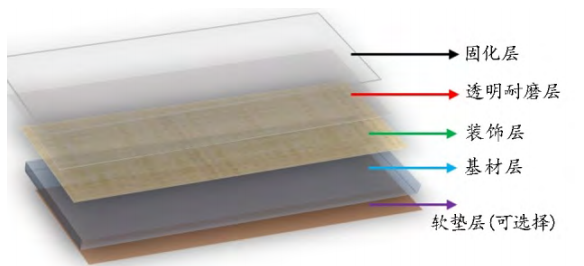 石木高分子复合地板为复合多层结构,层数可根据应用场所、安装方法不同而变化,通常由4~6层结构叠压而成,一般由紫外光(UV)固化层、透明耐磨层、装饰层、基材层、底层(软垫层)等组成,如下图所示。