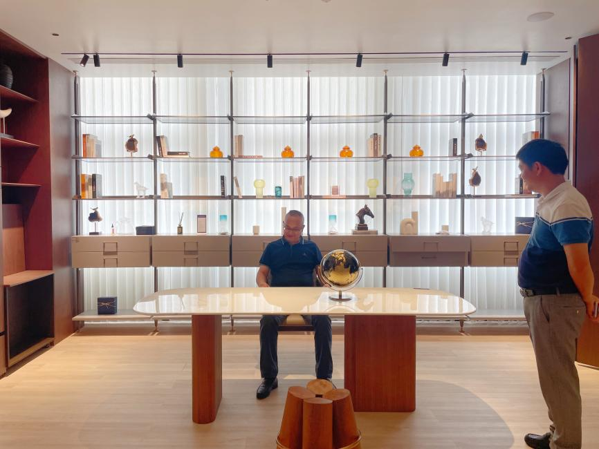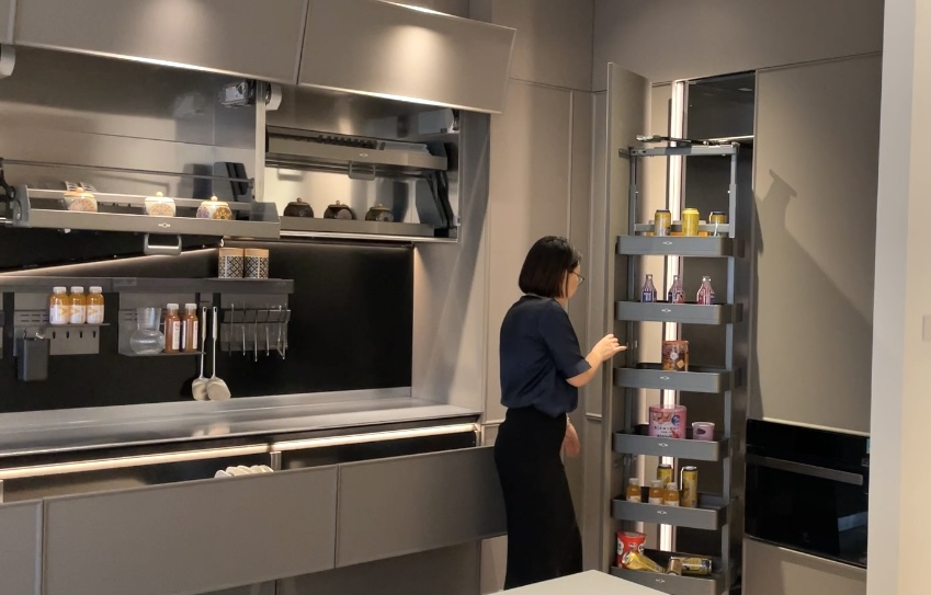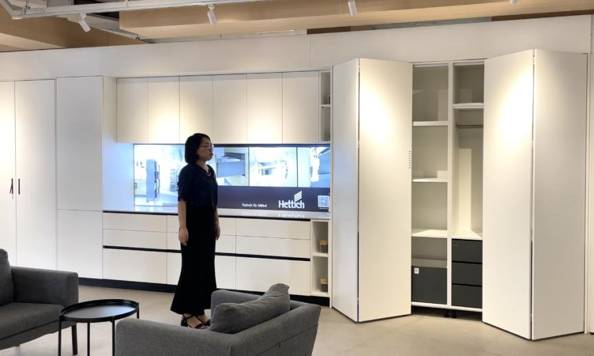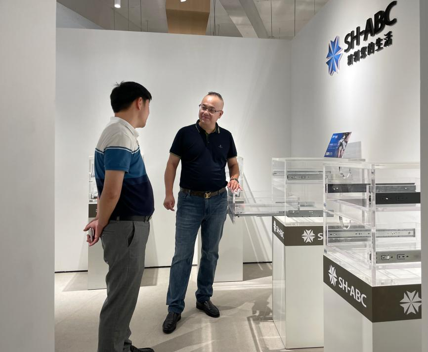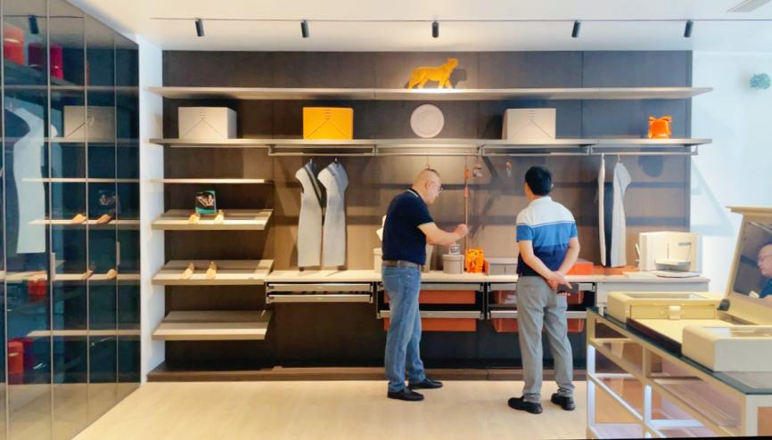 新型五金配件赋予家具新的体验,林董带领徐秘书长先后体验了厨房、衣帽间、书房、酒窖、客厅、玄关等区域的五金解决方案。他表示,建立一个沉浸式的五金功能展厅,可以让设计师或者用户更好更直观的理解和体验、有助于打开思路,将自身需求更好的融入定制产品中。林董对于品质的把控非常严格。他认为款式和颜色只是一时,功能才是永恒的,最终还是要解决使用问题。