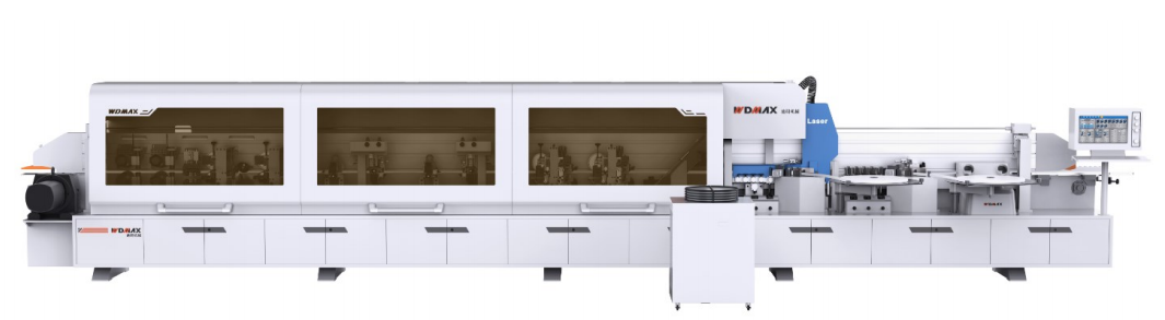特点:高速激光封边机,预铣+双色 PUR 上熔胶+五轮压贴 1+激光仪+五轮压贴 2+齐头+粗修+精修+高速跟踪+刮边 1+刮边 2+平刮边+双抛光