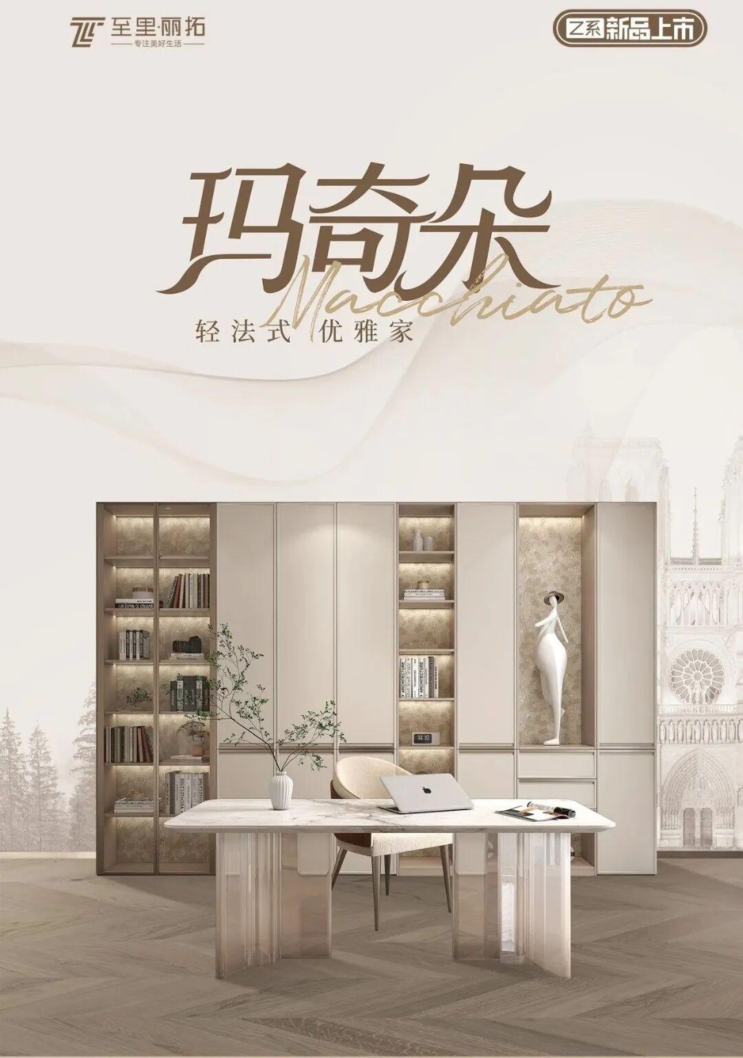 1、至理丽拓家居新品玛奇朵上市。该系列融合法式艺术,用暖调灰色搭配,营造优雅的空间格调。油画质感的印花背板汇聚艺术气质。