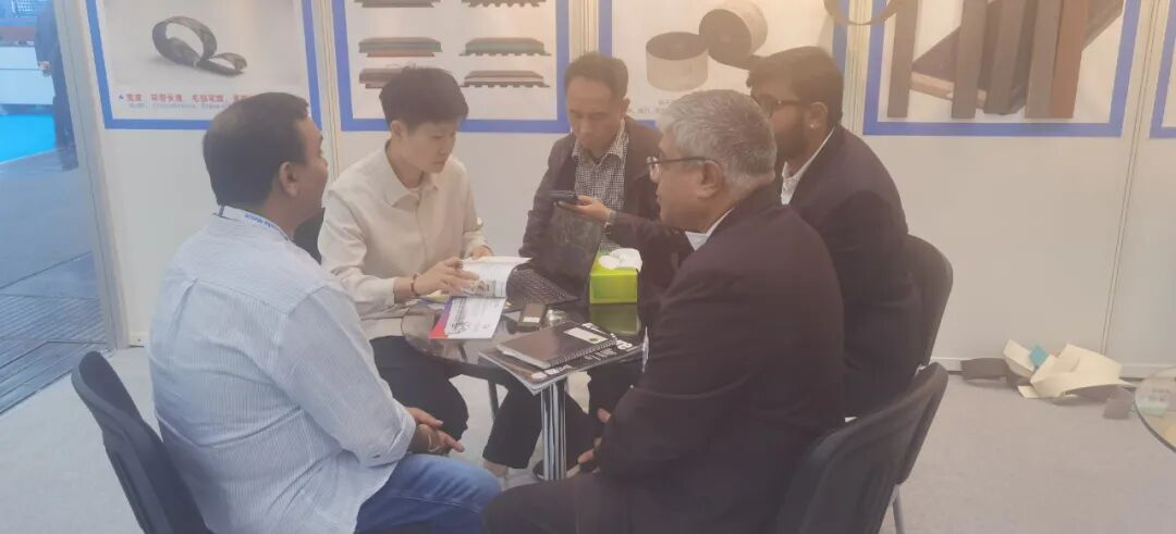 2、5月15日,协会副会长单位青岛柯乐弗机械有限公司参加德国汉诺威木工机械展,总经理秦增春在与国外客商洽谈。