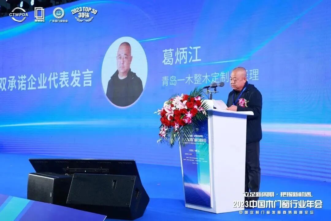 在“质量·服务”双承诺活动环节,关润开会长代表全国木门双承诺企业宣读“木门影响力品牌倡议”,在与会来宾的共同见证下,“2023年全国市场、工程木门及定制家居企业产品质量、售后服务双承诺活动”单位逐一揭晓,青岛一木整木定制总经理葛炳江代表优秀双承诺企业进行发言。