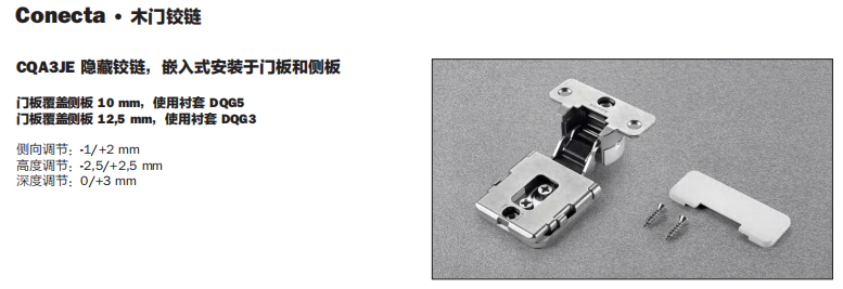 Conecta 铰链的开启角度为 94°,具有全方位的三维偏心调节功能,并内置集成阻尼缓冲系统。