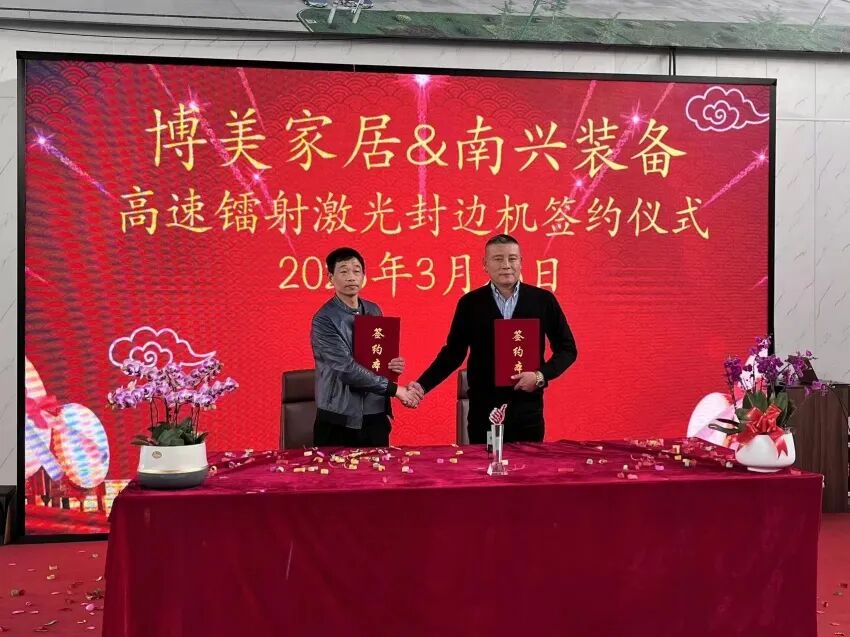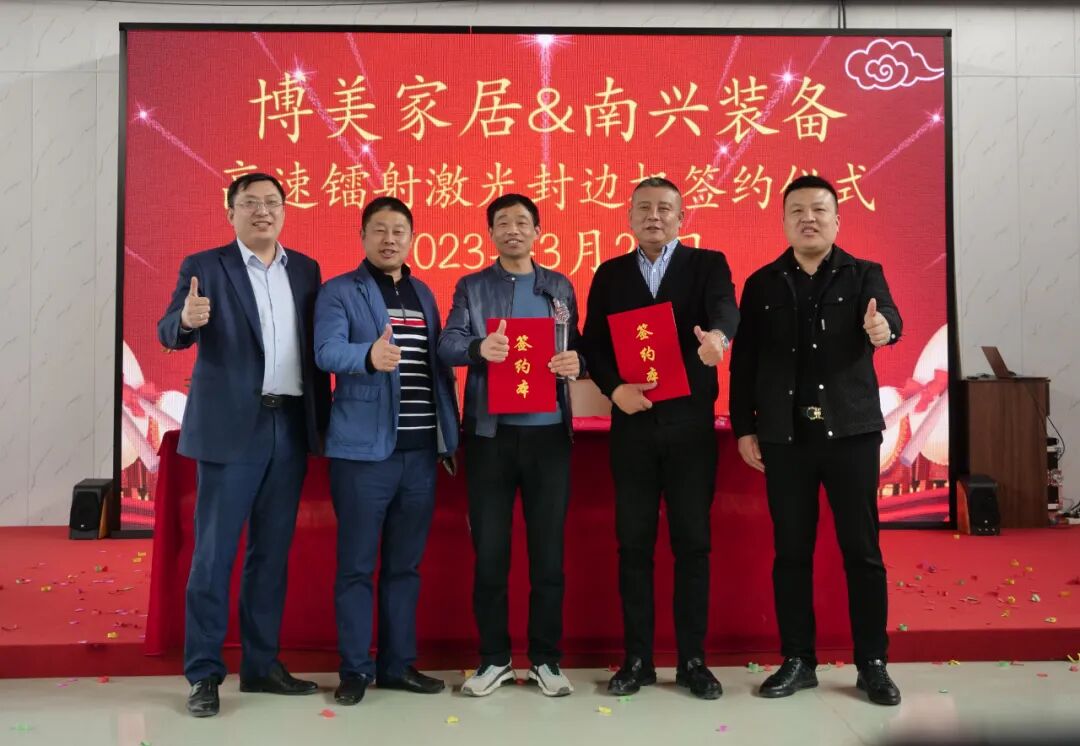 南兴装备与米尔伦萨、博美家居举行高速镭射激光封边机签约仪式
