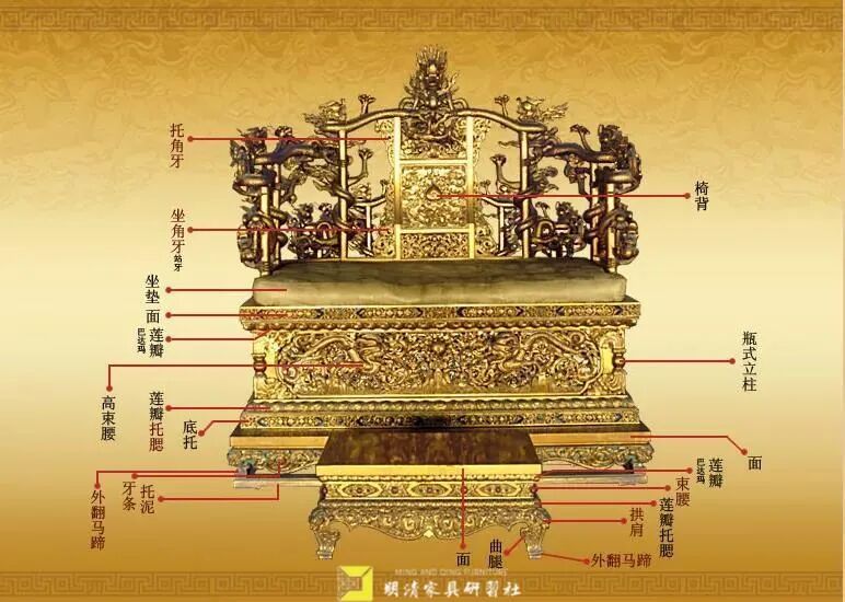 以“龙椅”为例,其故意夸大的尺寸、满身髹饰的金漆、环绕盘旋的十三条金龙......这些罕有同例的特点正象征着真龙天子的至高无上和唯我独尊。