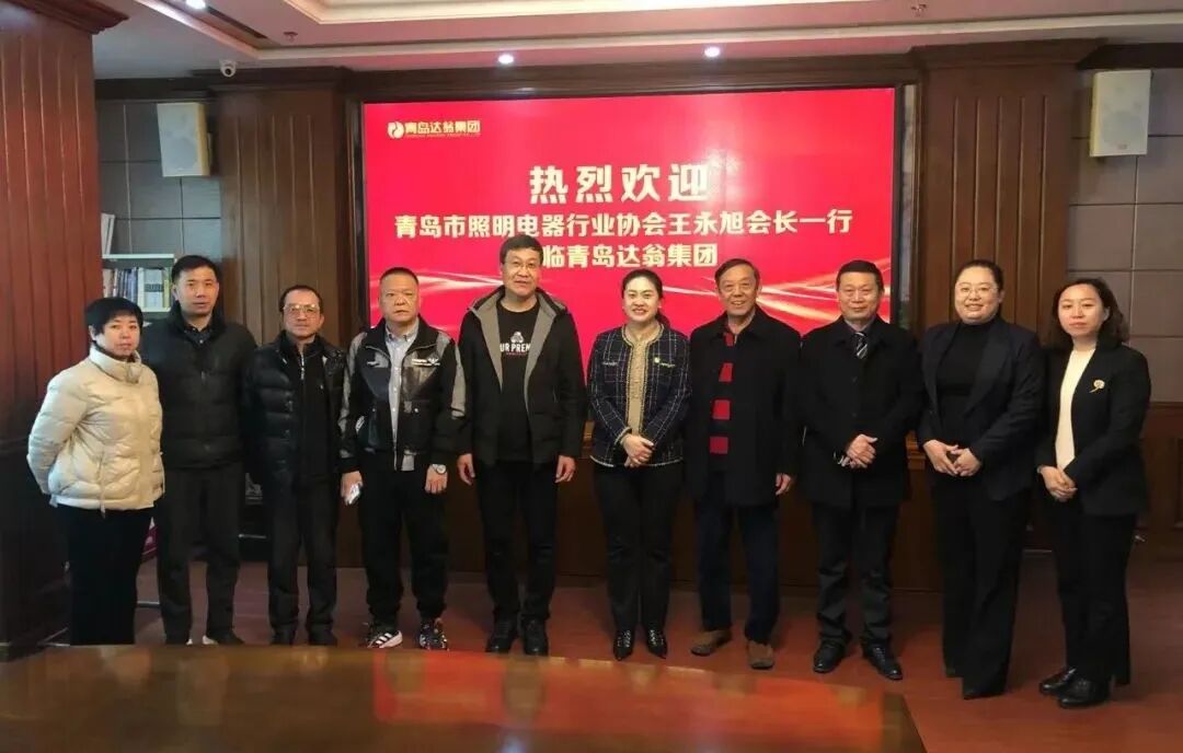 2月3日上午,青岛市照明电器行业协会会长王永旭、党支部书记卢振壁、常务副会长兼秘书长陈小光一行来到青岛达翁集团,达翁集团总裁戚振香携公司管理干部共同接待,双方交流沟通。