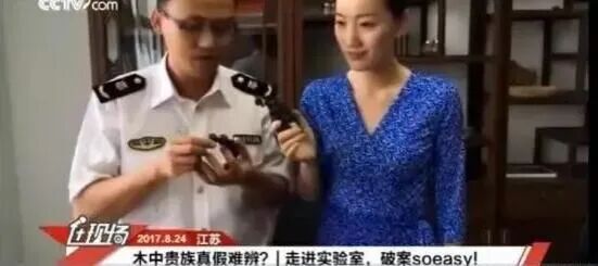 2017年8月24日,CCTV的专题节目再一次为血檀报道。报道中记者来到国家质检总局,国家材种鉴定与木材检疫重点实验室的陈主任向记者介绍:血檀与印度小叶紫檀是一对亲兄弟,只是一个长在非洲,一个长在印度。价格上相差70倍,但是无论宏观上的纹理、油性;还是在显微镜下其切片的微观结构,都是基本“零差距”的。