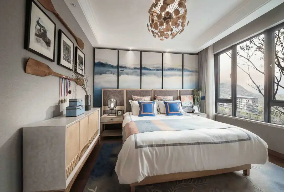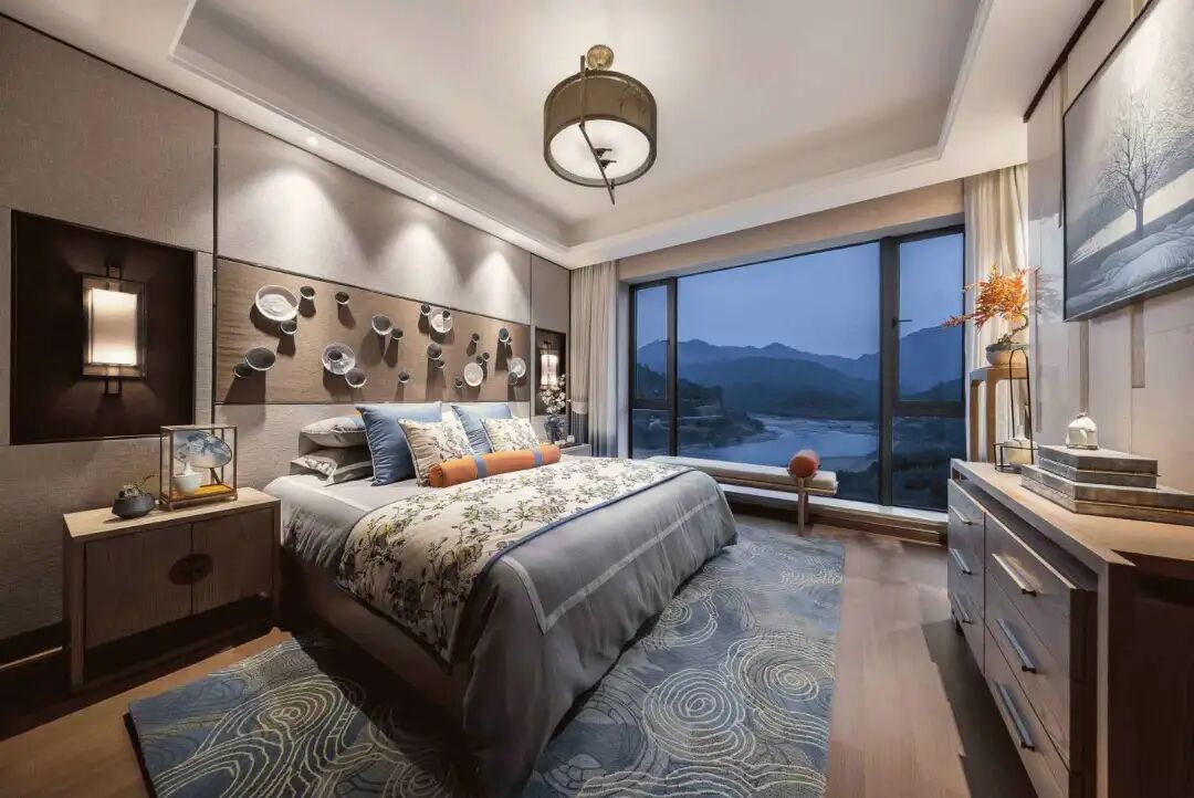 其次,选择落地窗也能更好实现“窗外横山入画”的传统借景手法,并且为能得到好的观景效果,对落地窗的开扇设计也有着一定的要求,合理的开扇设计更能达到好的观景效果。而开扇数量过多把视线分隔,对整体空间效果也有影响。