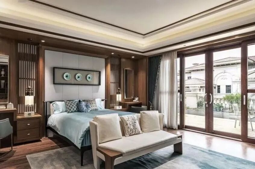 新中式装修讲究设计线条简约流畅,所以在门窗的选择上更多偏向于明亮雅致的落地窗,而非古色古香的雕花小窗。