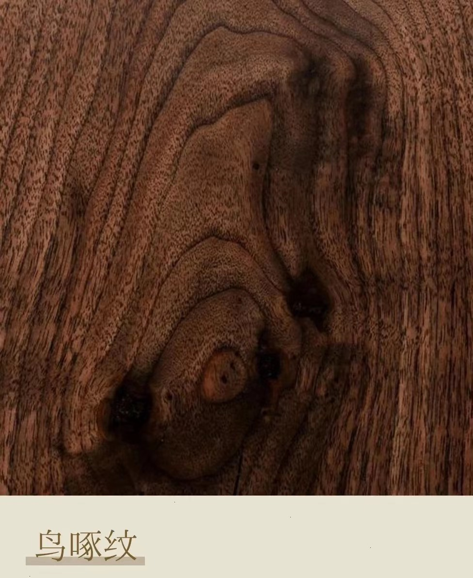 鸟啄纹:树木在漫长的生长过程中,不可避免的会受到各种环境因素影响,鸟啄纹便是由鸟啄或人为引起的纹理,通常也称为“活节”,与周围木质紧密连接,因此稳定性大可放心。