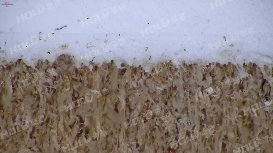 首先,在体视显微镜下,使封边带与板材交界处放大到100微米的情况下,可以明显看出封边带与板材已经完全融合到一体。