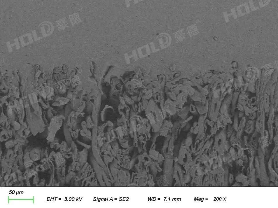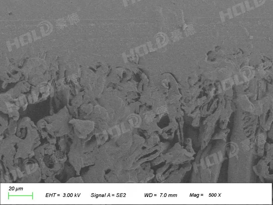 接下来,通过德国蔡司ZEISS Sigma 300场发射扫描电子显微镜研究,将结合界面分别放大200倍,500倍,1000倍,从获得的图像可以看出,区别于热熔胶封边的物理融化,豪德激光熔覆封边技术使封边带与板材产生相互融渗作用,板材纤维进入了封边带,封边带材料渗入到人造板材,无缝粘接到一起,让封边带与人造板产生“焊接”,实现相融交错的效果。