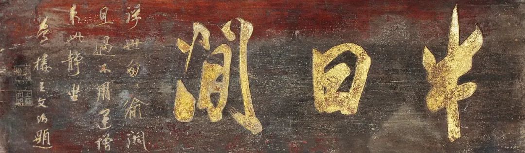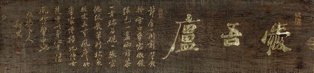 除了书斋名,一些匾额还会在旁边用小字镌刻题跋,阐述斋名的来由及出处,或加刻一段诗文短语,并在落款处,把书写者加盖的钤印也以镌刻的形式表现出来。