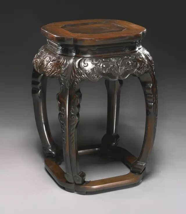 坐墩,圆形,腹部大,上下小,其造型尤似古代的鼓,故又叫“鼓墩”。一般在上下彭牙上也做两道弦纹和鼓钉,保留着蒙皮革,钉帽钉的形式。木制坐墩则常采用“开光”的做法来摹拟其构成式样。明代,墩面隆起;清代为平面,四面都有装饰,又添黑漆描金彩绘、雕漆、填漆等精美异常。