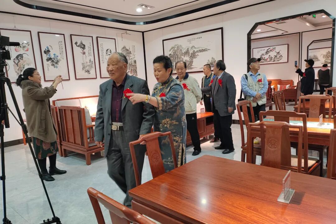 王绪恭中将和大明指画研究院向富邦红木·古玩城赠送墨宝。