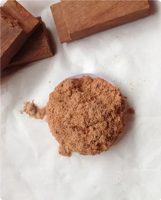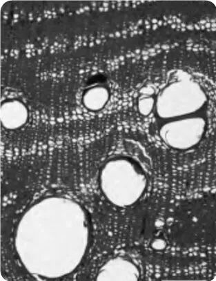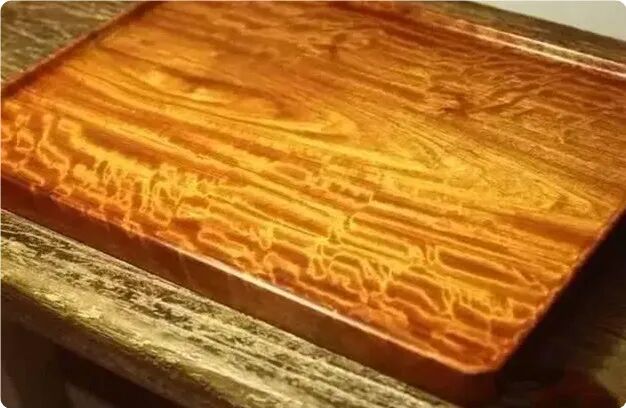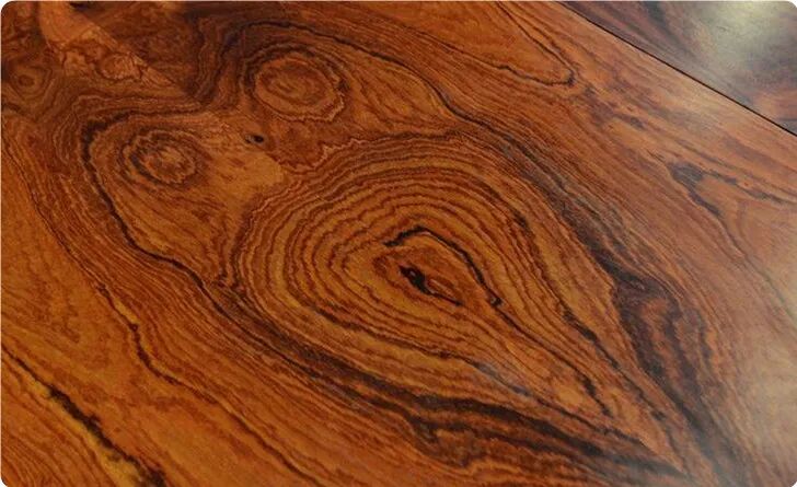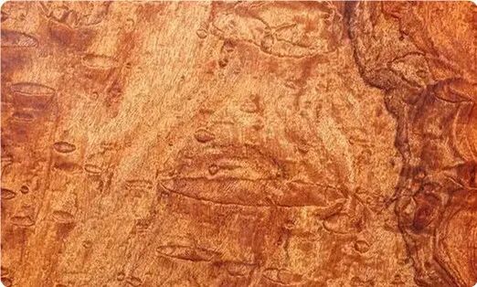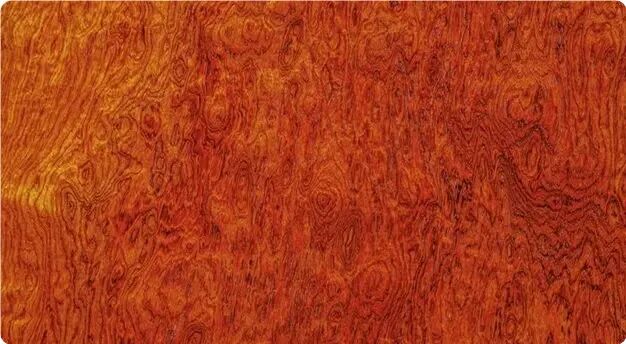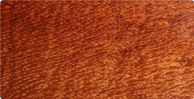 心材桔红、砖红或紫红色,常带深色条纹,划痕可见至明显,木屑水浸出液蓝色,荧光弱或无。管孔在生长轮内部者较大(但占生长轮的比例较其他种小),在肉眼下可见,弦向直径最大269μm,平均1 27 μm,数甚少至略少,1~1 5个/mm2,常含黄色沉积物。轴向薄壁组织在肉眼下明显,主为同心层式傍管带状/聚翼状及细线状 (宽1~4细胞),木纤维壁厚,木射线在放大镜下可见,波痕在放大镜下略明显或明显,射线组织同形单列。香气浓郁,结构细,纹理交错,气干密度0.80~O.86 g/cm3。木性稳定,结构细密、硬重,不易开裂、不易生虫、耐腐蚀,心材为红褐色,木纹清晰,花纹细腻美观,而且有鬼脸,有些部位有明显的虎皮纹,并散发出一种悠远醇厚,不张扬的檀香味,而深受广大红木爱好者的喜爱。03纹路鉴赏