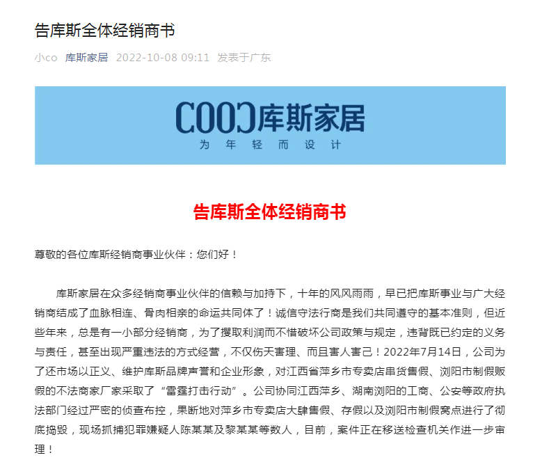 10月8日,库斯家居在“告库斯全体经销商书”中表示,近些年来,有一小部分经销商,为了攫取利润而不惜破坏公司政策与规定,违背既已约定的义务与责任,甚至出现严重违法的方式经营,不仅伤天害理、而且害人害己!