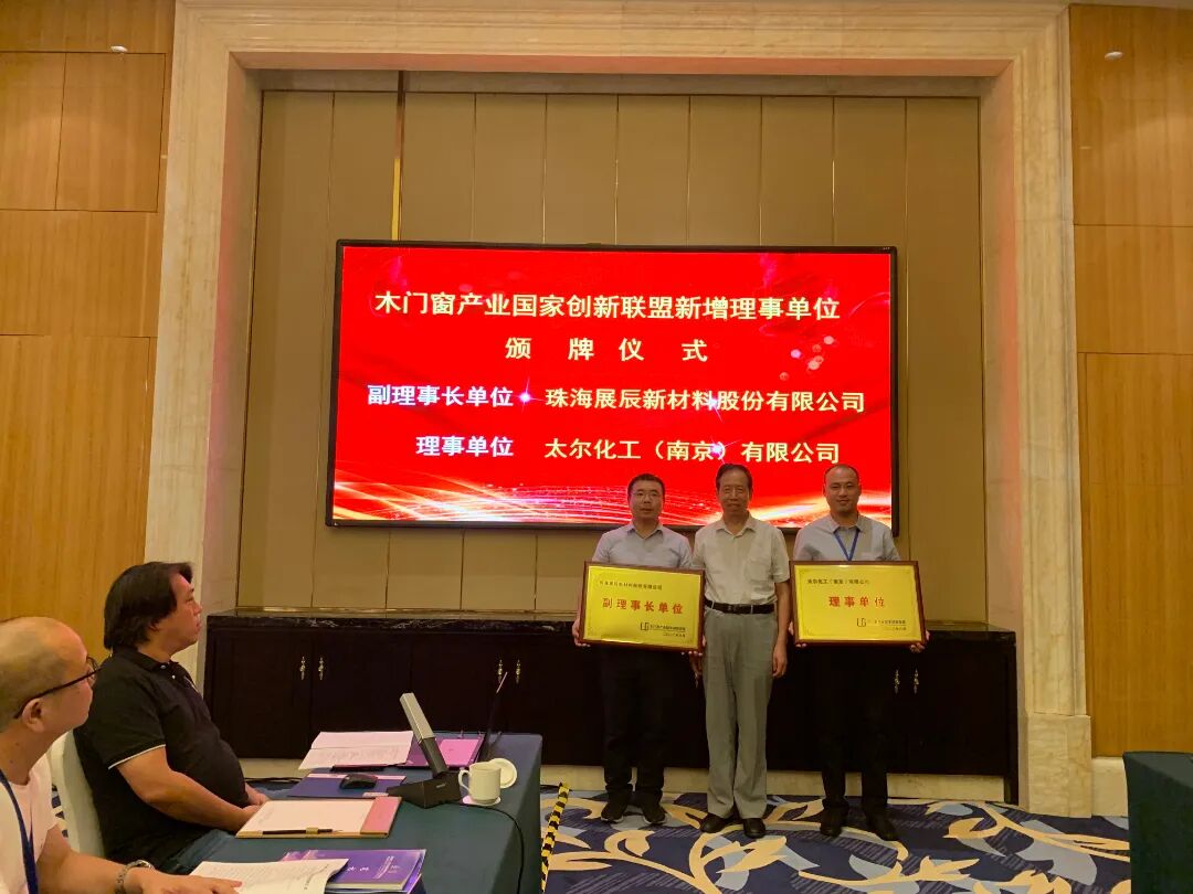 在本次会议前一天,还先期举行了木门窗产业国家创新联盟年度工作会议。会上,珠海展辰新材料股份有限公司当选木门窗产业国家创新联盟副理事长单位,展辰新材营销总监杨求贵先生还被聘请为木门窗产业国家创新联盟第一届理事专家委员会委员,任期3年,并颁发专家证书。