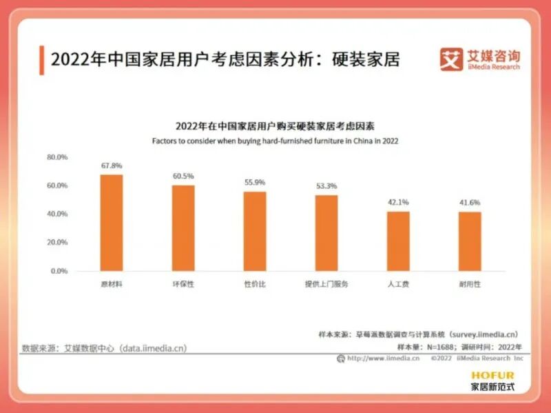 数据显示,67.8%的家居用户在购买硬装家居时会考虑产品的原材料;60.5%的家具用户考虑的是环保性。