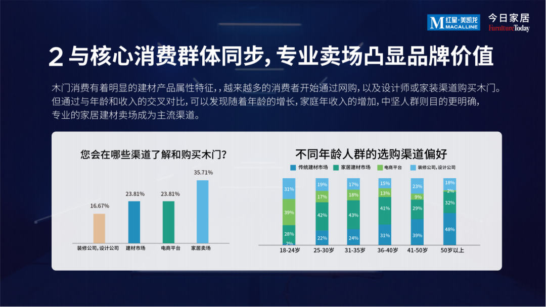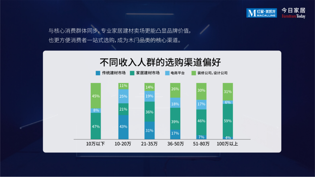 与核心消费群体同步,是木门品牌获得成功的第一步。调研显示,随着年龄的增长,家庭年收入的增加,中坚人群者目的更明确,专业的家居建材卖场成为主流渠道。