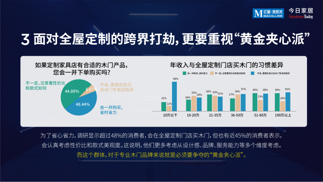 这说明,他们更多考虑从设计感、品牌、服务能力等多个维度考虑。而这个群体,对于专业木门品牌来说就是必须要争夺的“黄金夹心派”。