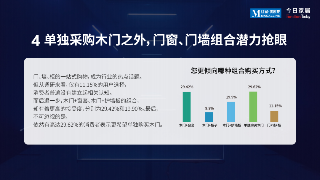 门、墙、柜的一站式购物,成为行业的热点话题。但从调研来看,仅有11.15%的用户选择,消费者普遍没有建立起相关认知。而后退一步,木门+窗户(窗套)、木门+护墙板的组合,却有着更高的接受度,分别为29.42%和19.90%。