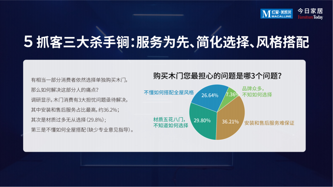 针对这些消费痛点,报告认为要“服务为先、简化选择、风格搭配”。基于品牌的专业担当,木门品牌首先要安装和售后服务的担忧,为最终的呈现效果负责。