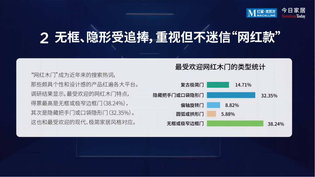 从产品来看,得票最高的分别是无框或极窄边框门(38.24%),其次是隐藏把手门或口袋隐形门(32.35%),这也呼应了最受欢迎的现代和极简两类风格。
