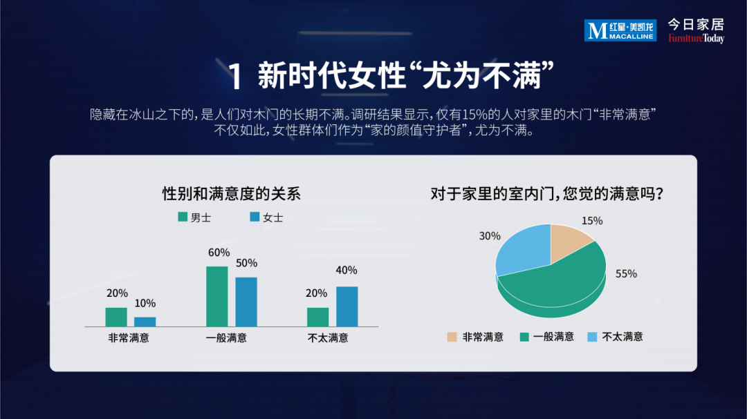 但消费者对木门产品的满意度却不高。调研结果显示,仅有15%的被调研者表示对家里的木门“非常满意”。不仅如此,女性群体作为“家的颜值守护者”,尤为不满。