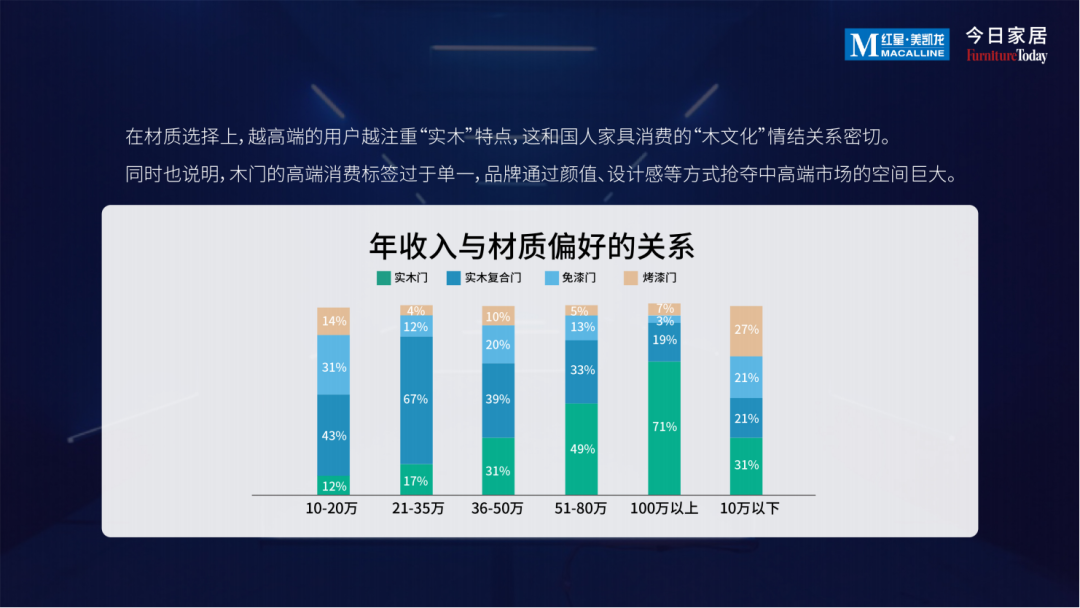 调研显示,通过“年收入”与“最喜欢的材质”两大指标的交叉分析,可以发现在材质选择上,越高端的用户越注重“实木”特点,这和国人家具消费的“木文化”情结关系密切。但同时也说明,木门的高端消费标签过于单一,品牌通过创新的设计和技术抢夺中高端市场的空间巨大。