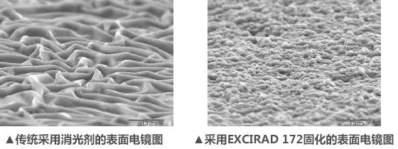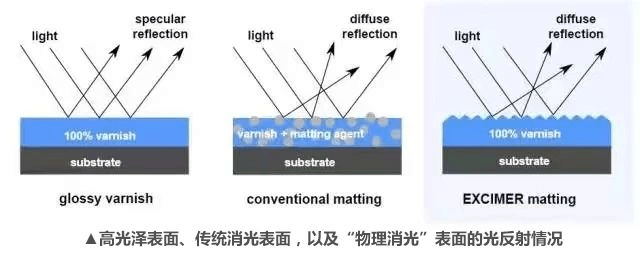 膜压技术,即在做好底漆的工件上,辊涂UV面漆,用肤感膜压压平肤感面漆,通过UV光源固化后,把膜揭掉,就得到膜压的肤感产品。膜压技术也有其限制性,即只能加工平面产品,并且由于肤感膜的微观结构限制,这类产品,肤感的时效性,在一定条件下,会有所限制。目前,在国内的应用,肤感膜都是一次性使用,导致运营成本也偏高。目前,自干型油漆(PU漆和水性漆)都能通过油漆配方,来实现肤感效果。不过,PU肤感漆出现较早,水性肤感漆出现较晚,国内目前已经有好几家油漆厂能够提供水性肤感漆。来自于德国的IOT公司创造的172纳米的UV固化设备(EXCIMER)具有独特的性能,堪称UV固化技术的“黑科技”。准分子灯固化技术的生产原理是:UV涂料配方中的丙烯酸酯双键在吸收172纳米紫外光后,可生成自由基,且无需光引发剂。同时,172纳米UV的穿透深度仅为100到500纳米,因此涂料只有表面极薄的一层被固化。这一薄层的聚合和交联,会发生收缩而形成不光滑的表面,并漂浮在未固化的下层液体上,达到表面哑光的效果。这种消光的方法由于不需要使用消光剂,因此被称为“物理消光”。同时,172纳米下表面发生的聚合和交联可提供高的表面硬度及高涂料密度。