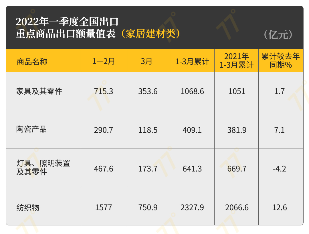 据海关统计,今年一季度,家具及其零件出口额为1068.6亿元,同比增长1.7%;陶瓷产品出口额为409.1亿元,同比增长7.1%;灯具、照明装置及其零件出口额为641.3亿元,同比下降4.2%;纺织纱线、织物及其制品出口额为2327.9亿元,同比增长12.6%。从3月份单月来看,家具及其零件出口额为353.6亿元;陶瓷产品出口额为118.5亿元;灯具、照明装置及其零件出口额为173.7亿元;纺织纱线、织物及其制品出口额为750.9亿元。1—2月份具体数据请查看77度此前发布文章:下滑!1-2月家具外贸出口715.3亿。