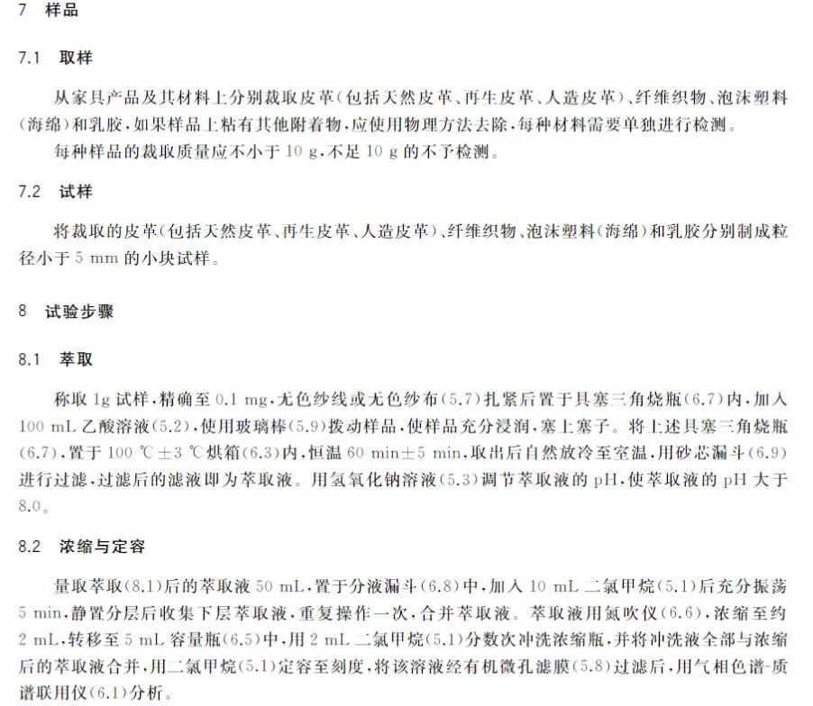 关于家具样品,《测定方法》明确了取样和试样步骤。其中,取样,是指将家具产品及材料上分别裁取皮革(包括天然皮革、再生皮革、人造皮革)、纤维织物、泡沫塑料(海绵)和乳胶,如果样品上粘有其他附着物,应使用物理方法去除,每种材料需要单独进行检测,且每种样品的裁取质量应不小于10g,不足10g的不予检测。对于试样,是指将裁取的皮革(包括天然皮革、再生皮革、人造皮革)、纤维织物、泡沫塑料(海绵)和乳胶分别制成粒径小于5mm的小块试样。