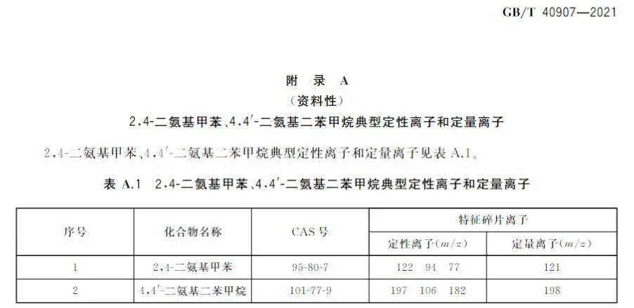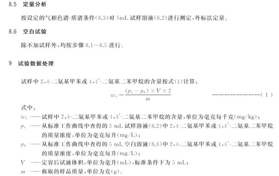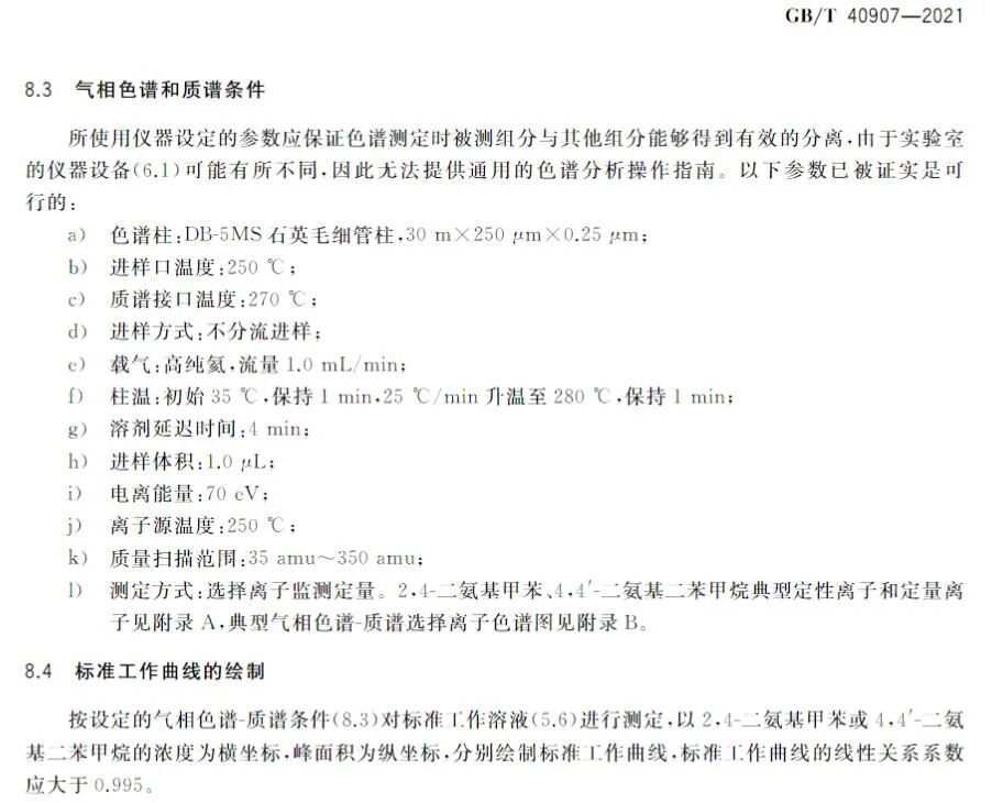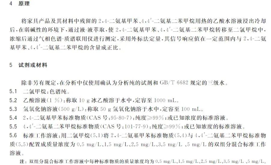 《测定方法》明确了原理,将家具产品及其材料中残留的2,4-二氨基甲苯、4,4’-二氨基二苯甲烷用热的乙酸水溶液浸出冷却后,在弱碱性的环境下,通过液—液萃取,使2,4-二氨基甲苯、4,4’-二氨基二苯甲烷转移至二氯甲烷中,浓缩后通过气相色谱—质谱联用仪进行测定,采用外标法定量,其信号响应值在一定范围内与2,4-二氨基甲苯、4,4’-二氨基二苯甲烷的含量成正比。
