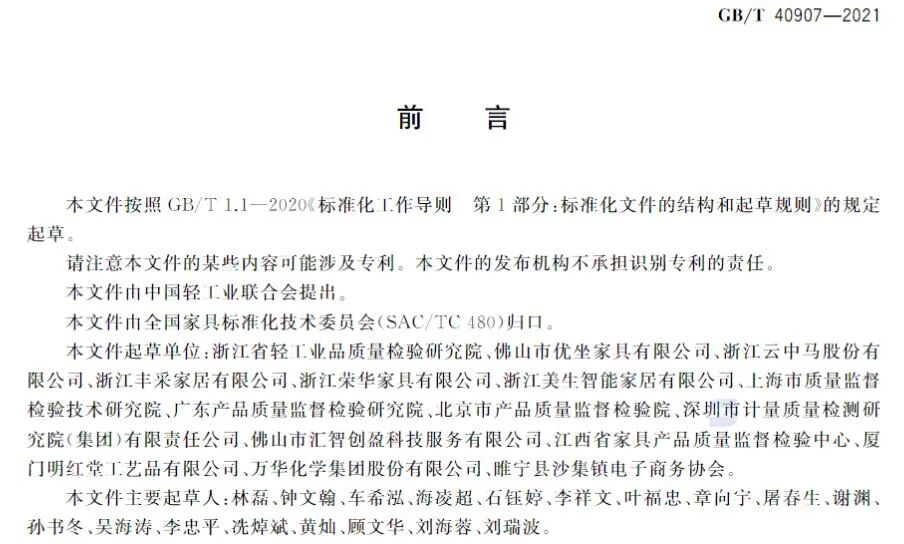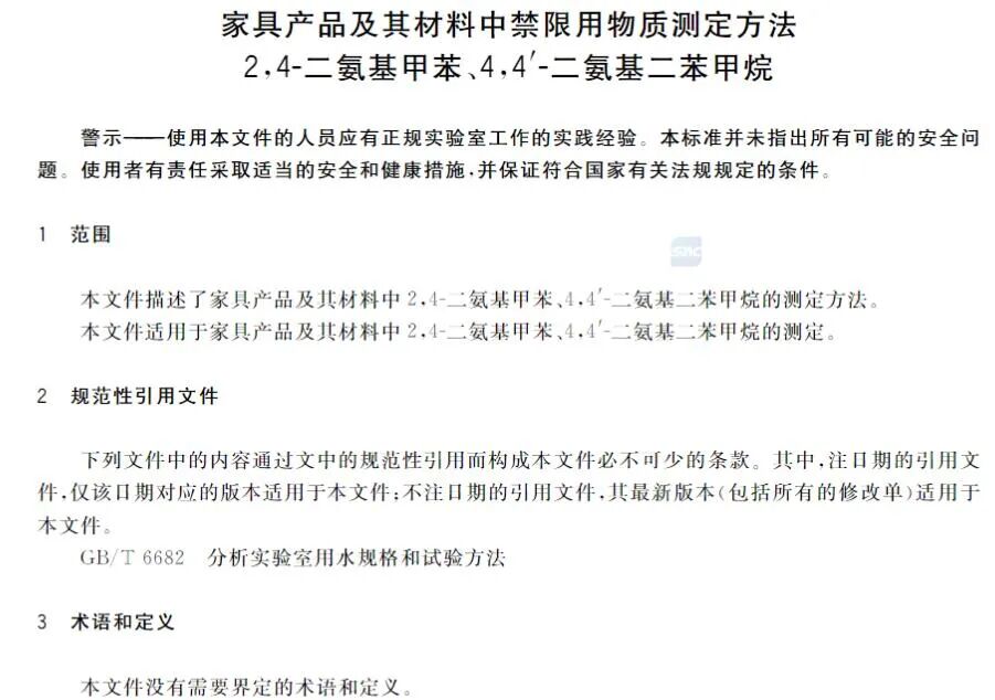 政府采购信息网(caigou2003.com)获悉,国家市场监督管理总局联合中国国家标准化管理委员会发布《家具产品及其材料中禁限用物质测定方法 2,4-二氨基甲苯、4,4’-二氨基二苯甲烷GB/T 40907-2021》(以下简称《测定方法》),适用于家具产品及其材料中2,4-二氨基甲苯、4,4’-二氨基二苯甲烷,自2022年5月1日起正式施行。