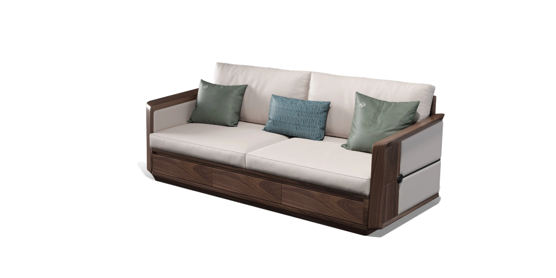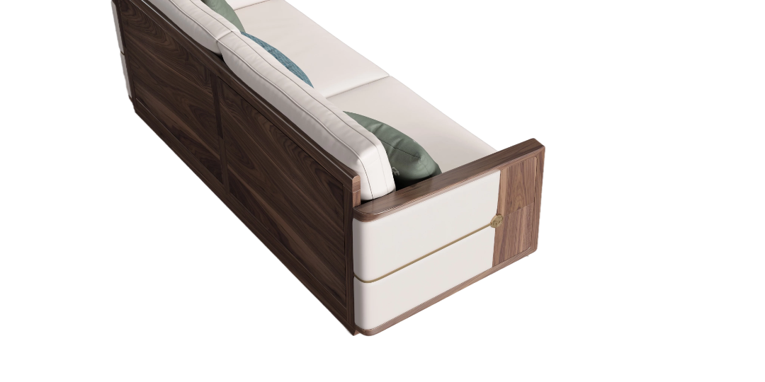 卓伊沙发采用名贵的北美胡桃木,意大利高品质小牛皮延续生命的美妙,镶嵌拉丝铜条体现当代简奢生活之道。“青岛一木”品牌LOGO点缀在扶手侧黄金分割的最佳位置,点睛之笔使产品独具人文气质和神韵,彰显艺术与人共生的设计精神。