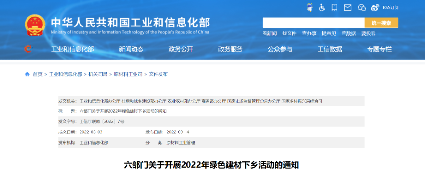 3月14日,工业和信息化部办公厅、住房和城乡建设部办公厅、农业农村部办公厅、商务部办公厅、国家市场监督管理总局办公厅、国家乡村振兴局综合司等六部门联合发布了《开展2022年绿色建材下乡活动》的通知。通知表示2022年将选择5个左右试点地区,引导绿色建材生产企业、电商平台、卖场商场等积极参与活动。鼓励有条件的地区对绿色建材消费予以适当补贴或贷款贴息。鼓励企业、电商、卖场等让利于民,助推绿色消费。试点地区:按照部门指导、市场主导、试点先行原则,2022年选择5个左右试点地区开展活动,有意愿的地区可依据本通知要求形成工作方案,向指导部门提出申请。通知强调,试点地区召开活动启动会后,下沉市、区(县)、乡(镇)、村,通过举办公益宣讲、专场、巡展等不同形式的线上线下活动,加快节能低碳、安全性好、性价比高的绿色建材推广应用。