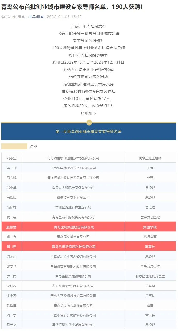 日前,市人社局发布《关于聘任第一批青岛创业城市建设专家导师的通知》,190人获聘首批青岛创业城市建设专家导师,将由市人社局授予聘书。聘期自2022年1月1日至2023年12月31日,并纳入青岛市创业导师资源库,组织开展创业服务活动,为创业城市建设提供智库支持。