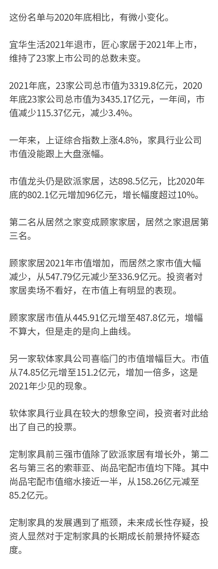 【行业新闻】欧派、顾家、居然之家位列前三,A股23家家具公司2021年底市值排名