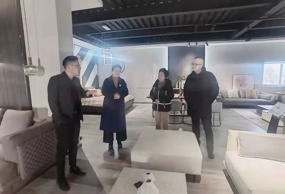 2021年 12月30日,青岛市家居行业协会会长戚振香、执行会长兼秘书长徐宝传、达翁家居广场总经理于金秀一同考察了协会理事单位青岛金巢家具有限公司。