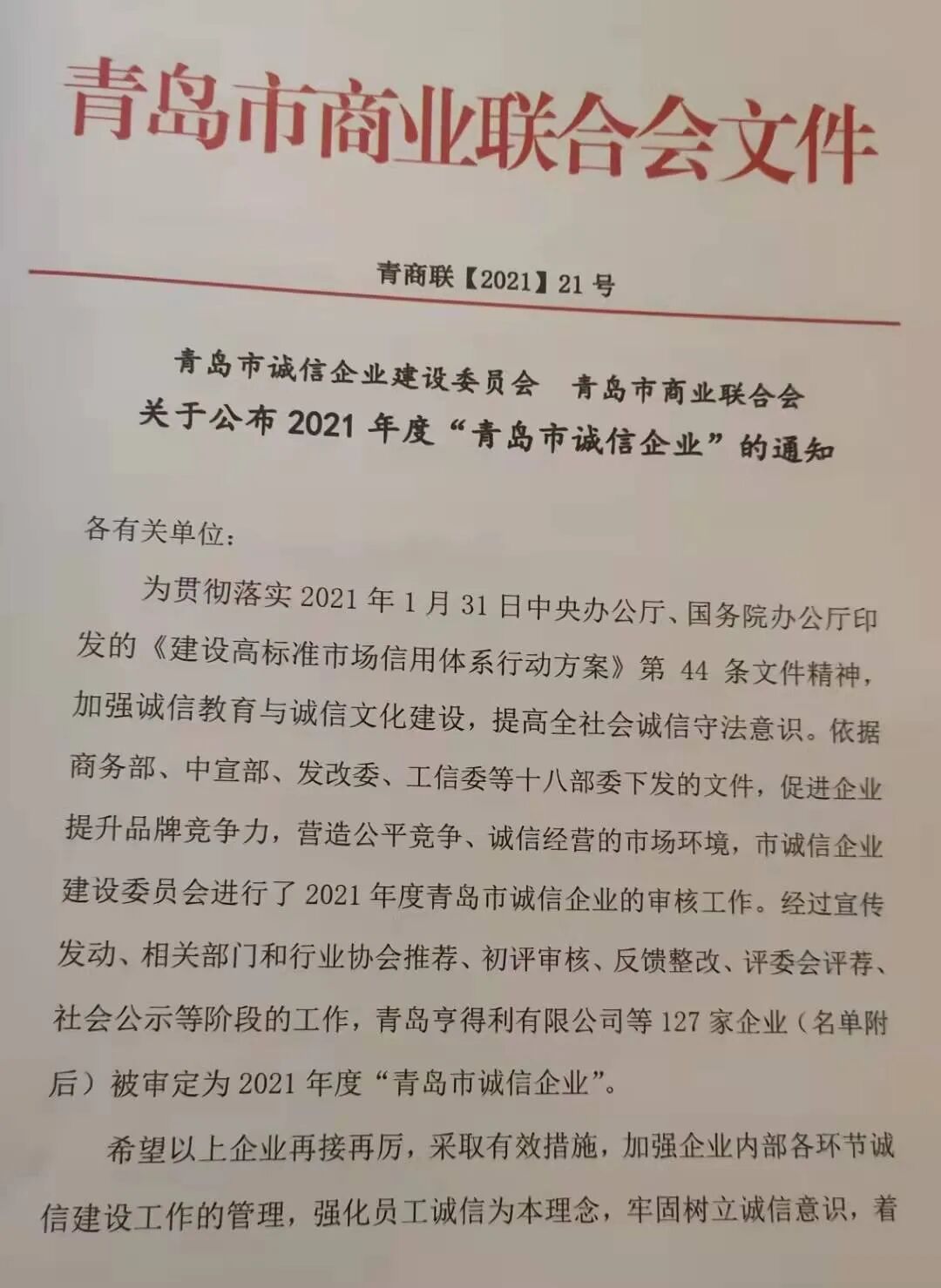 本年度“青岛市诚信企业”活动是由青岛市诚信企业建设委员会和青岛市商业联合会共同发起的,根据中央十八部委下发文件,促进企业提升品牌竞争力,营造公平竞争、诚信经营的市场环境,青岛市诚信企业建设委员会进行了青岛市诚信企业的推荐、审核、评委推荐、社会公示等多个阶段的工作,共有127家企业获此殊荣。