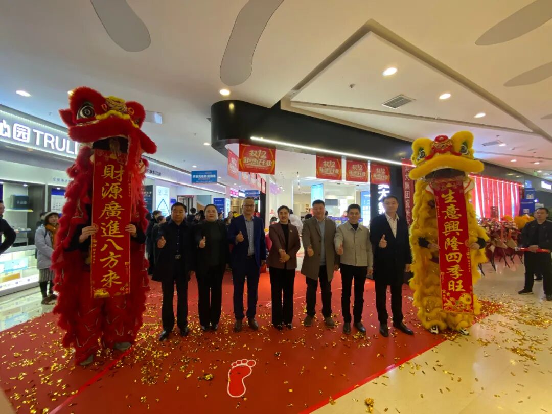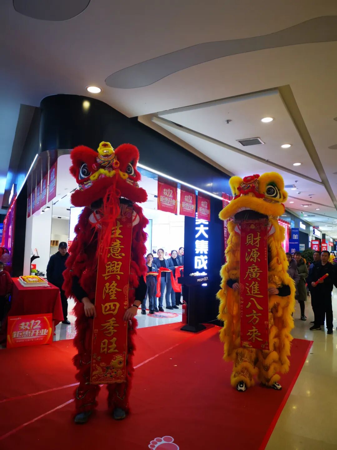 开业现场音乐飘扬,彩旗招展,还有舞狮表演现场祝贺。