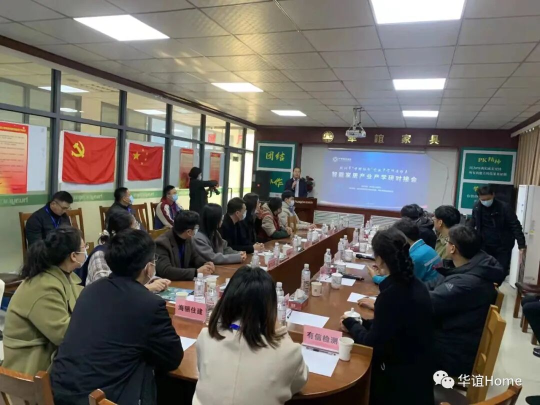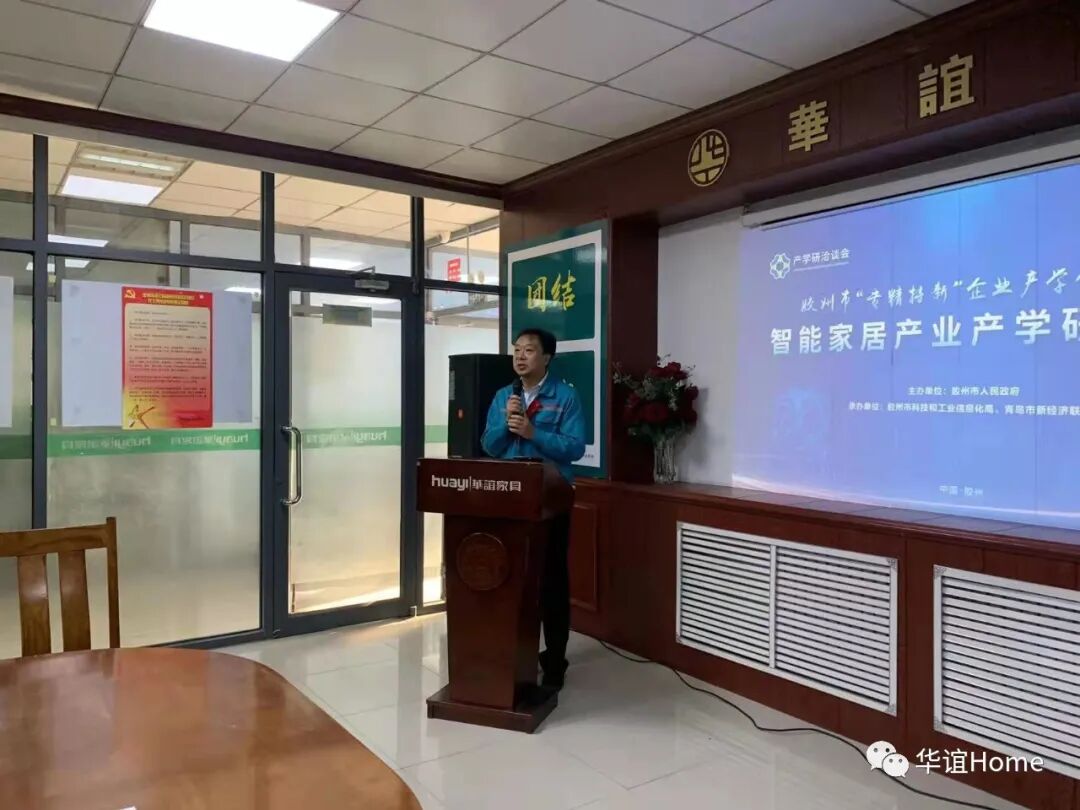 12月2日由胶州市政府、胶州市科技和工业信息化局、青岛市新经济联合会组织的“胶州市“专精特新”企业产学研活动月”——“智能家居产学研对接会 ”在华谊家具顺利举行。
