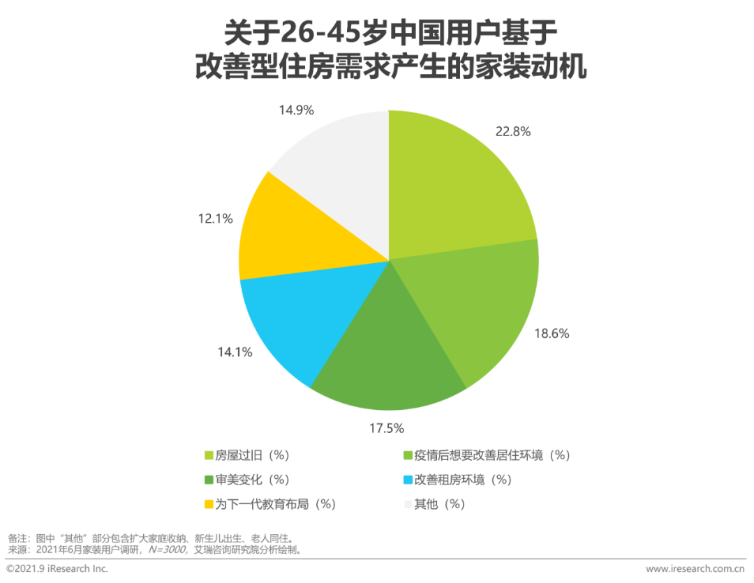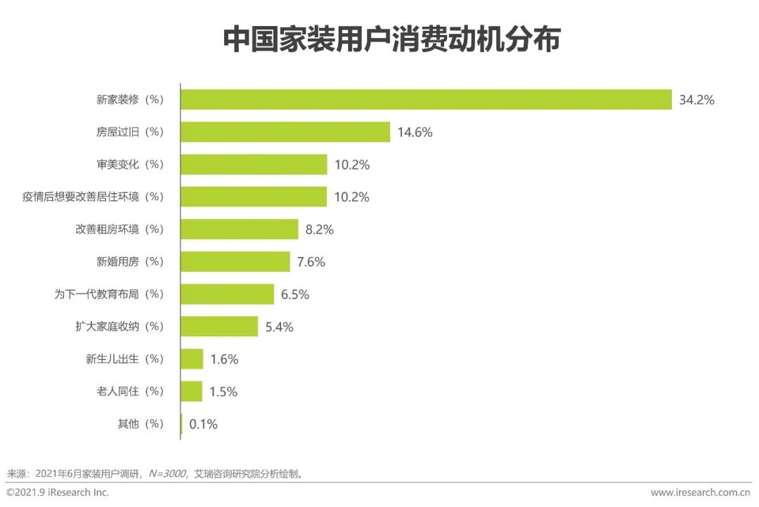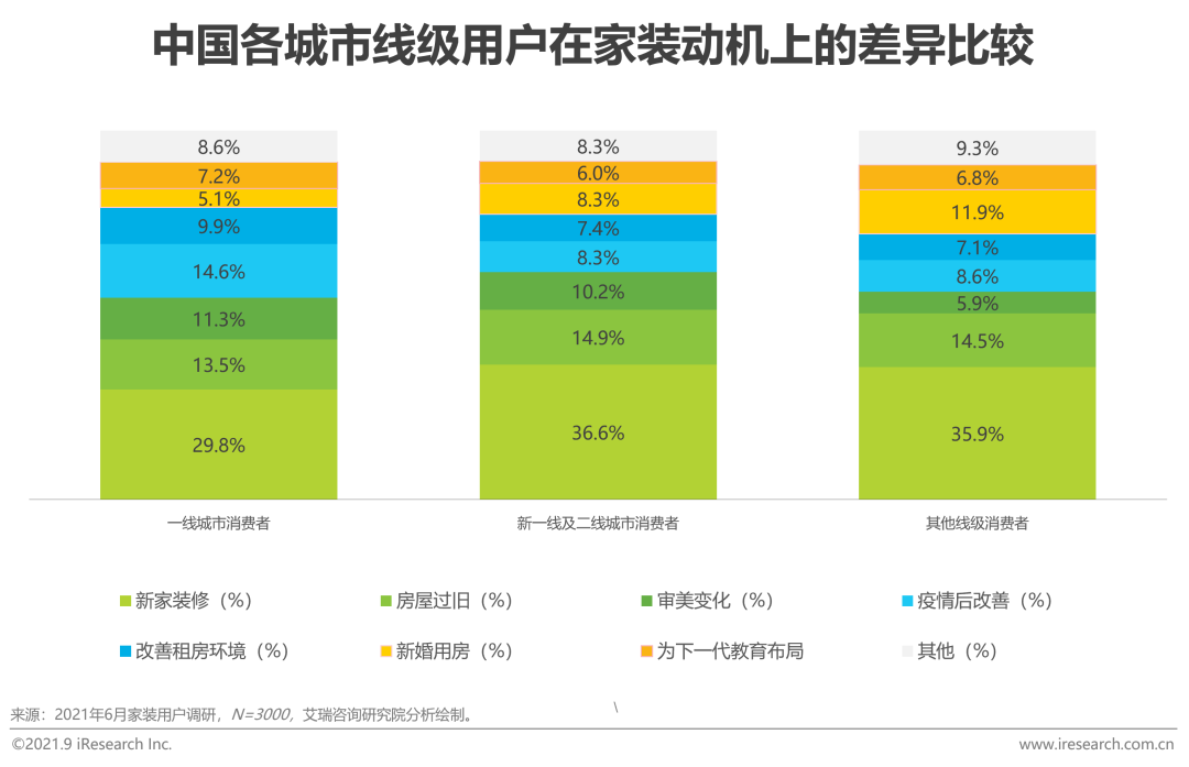 基于调研数据,新家装修的家装动机仍然居于家装消费需求产生的主要原因,其占比达到34.2%。但旧房改造(14.6%)、审美变化(10.2%)、扩大家庭收纳(5.4%)等存量房相关的比例已经超过30%,存量房的家装动机逐渐显现。从用户所在城市线级进行比较,出于改善旧房等存量房相关的家装动机的用户在一线城市用户、新一线及二线城市用户、其他线级城市用户的比例依次为65.1%、55.1%和52.2%。不难看出,改善旧有住房的家装动机在高线城市具有更高的渗透率,存量房改造逐步成为一线城市的房屋家装新动能。