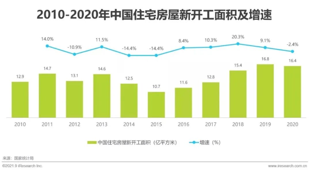 上世纪90年代末我国房改制度全面推行,房地产行业蓬勃发展,2010年至2020年,我国商品房销售面积除2014年相较2013年出现轻微下降,其余年份均同比增长,十年间积累了大量住房库存,同时近三年来我国年均新开工面积维持在16亿平方米上下。持续韧性的地产建设和地产销售对房地产投资起到一定的带动作用,为家装行业奠定了夯实的产值基础。
