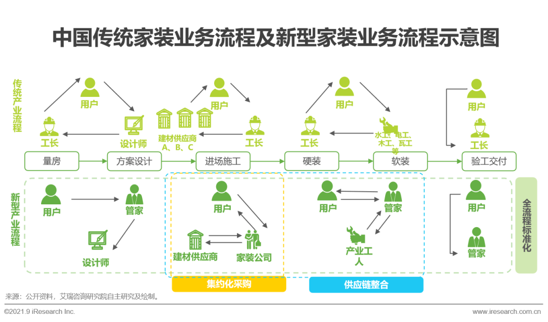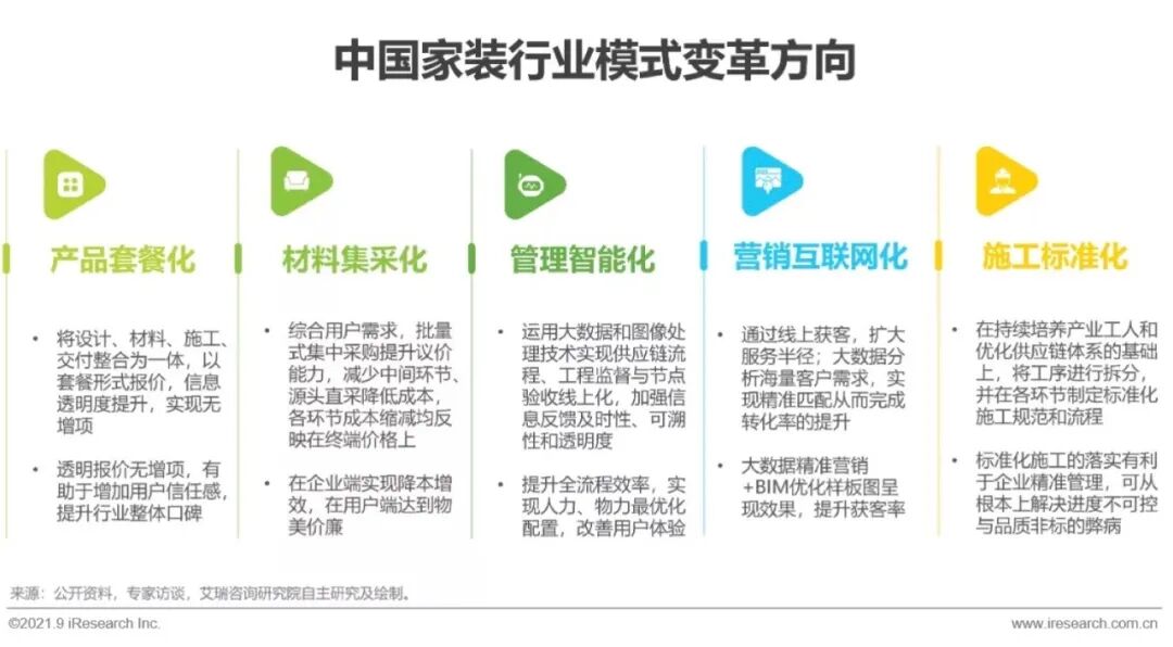 标准化服务体系的建立和用户对个性化定制的需求驱使家装行业上下游优质资源的整合,环节服务商逐渐向全产业链进行拓展。针对行业三类主要典型玩家,传统装企由硬装向下游扩张,转型为“装修+零售”型企业;连锁卖场由软装向上游扩张,转型为“零售+装修”型企业;定制类企业则同时向上下游进行纵向扩张,并与装企进行战略合作,转型为全屋解决方案提供商。艾瑞认为随着未来整装趋势的不断发展,行业主要玩家均将通过资源整合来实现效率最大化和用户体验优化。